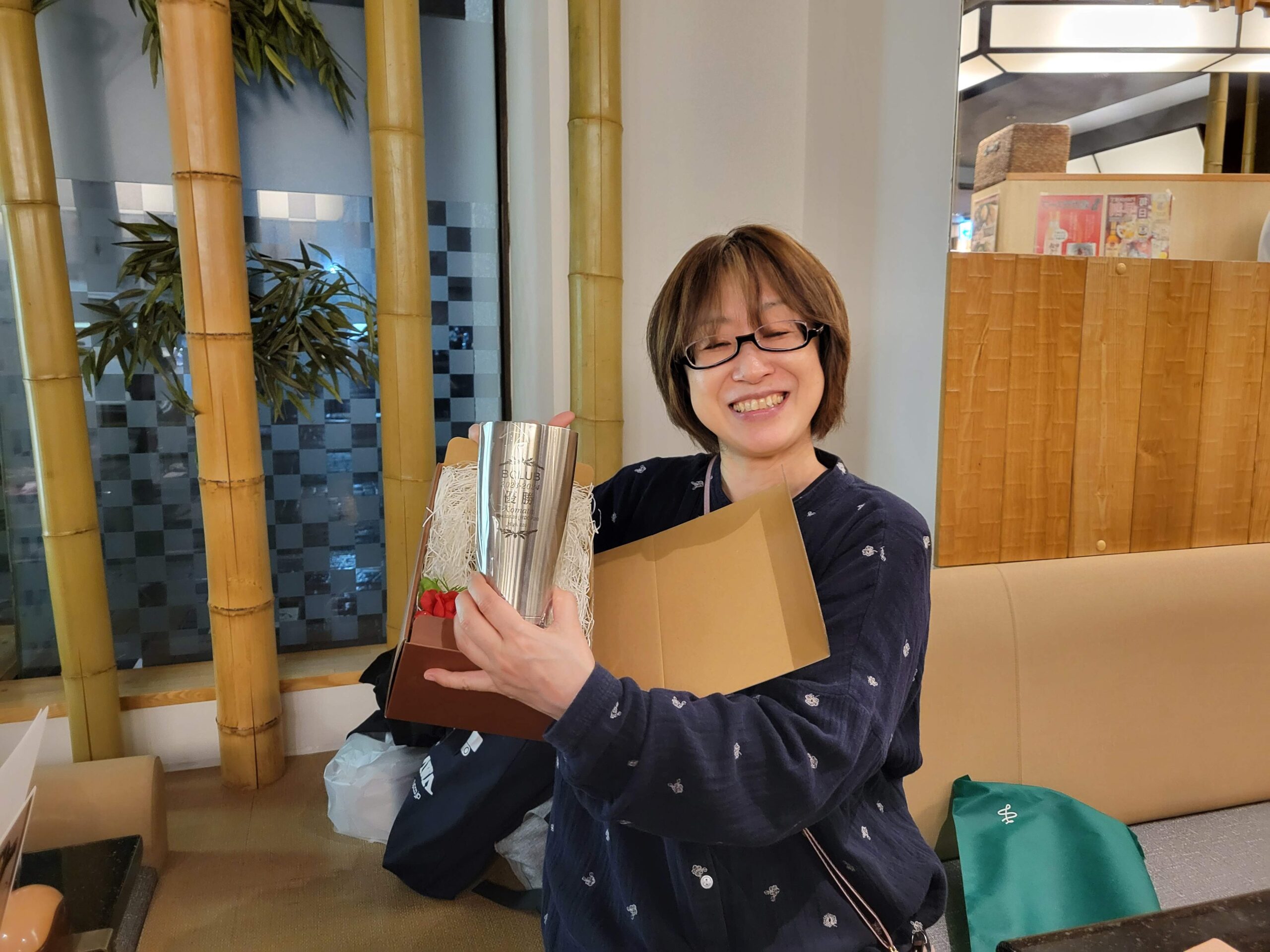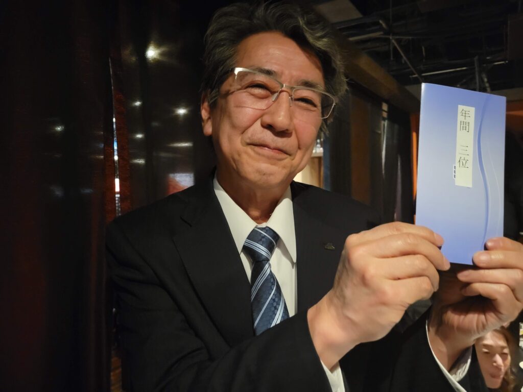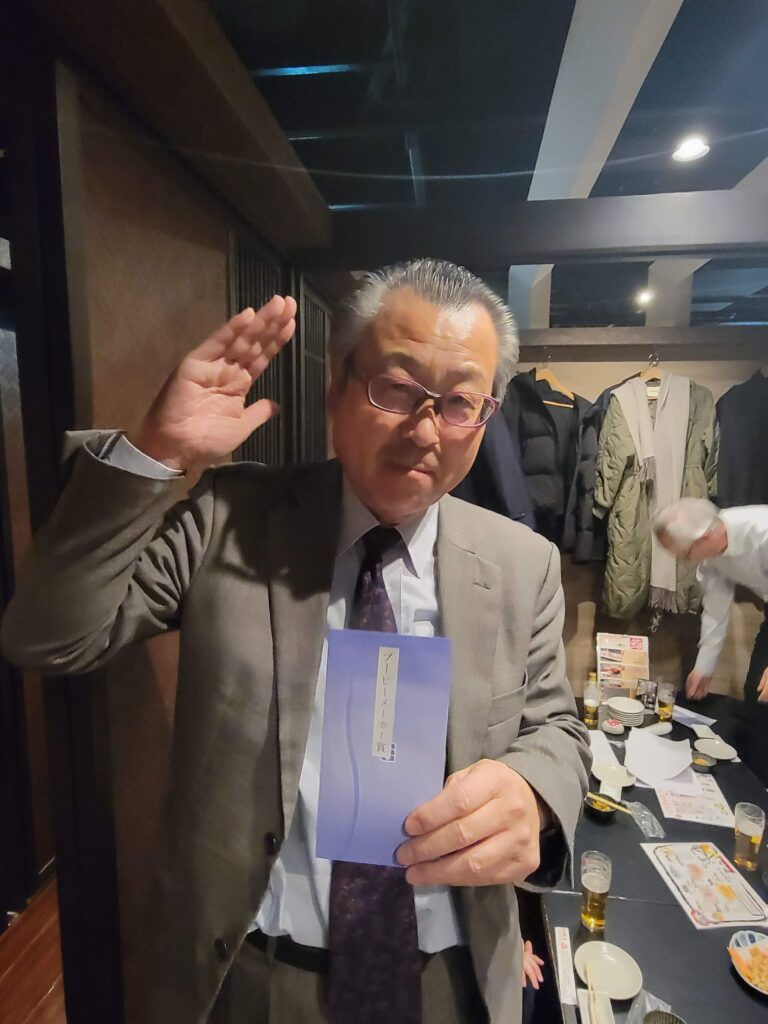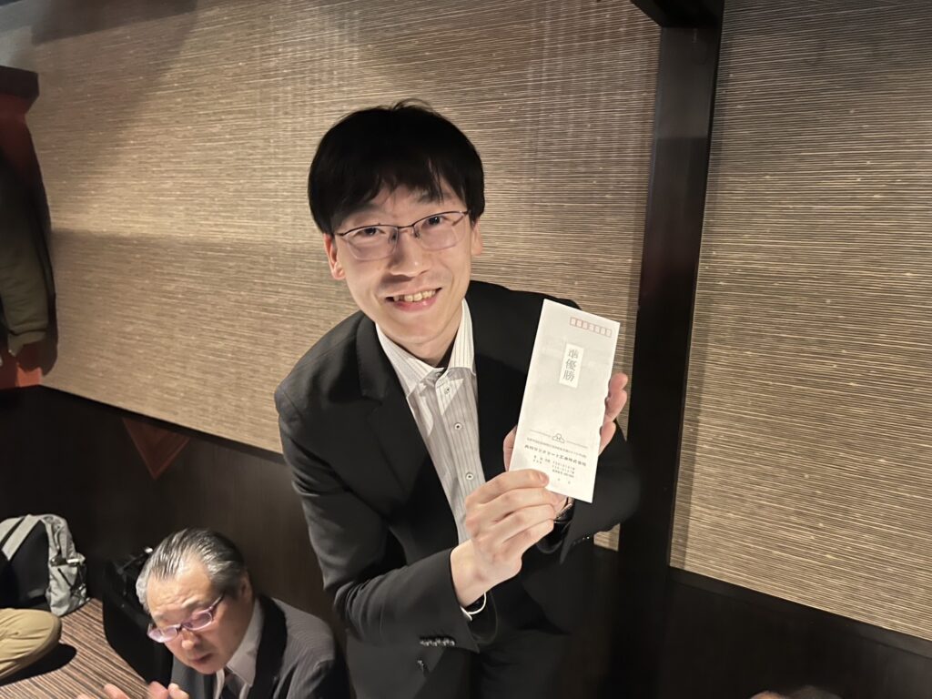 ボウリングの後の食事会にて、前年度優勝のkamotaさんに記念品贈呈がありました。