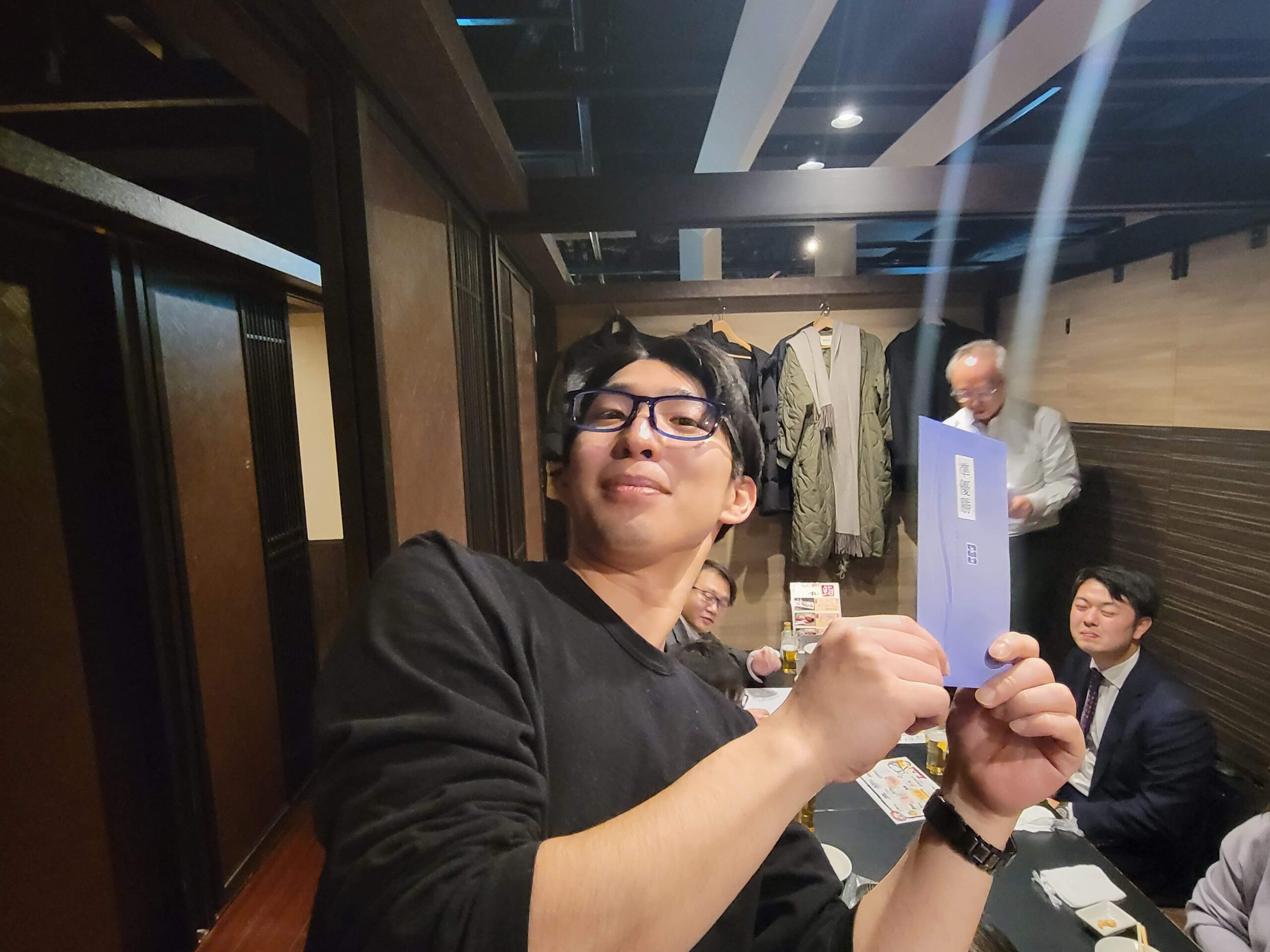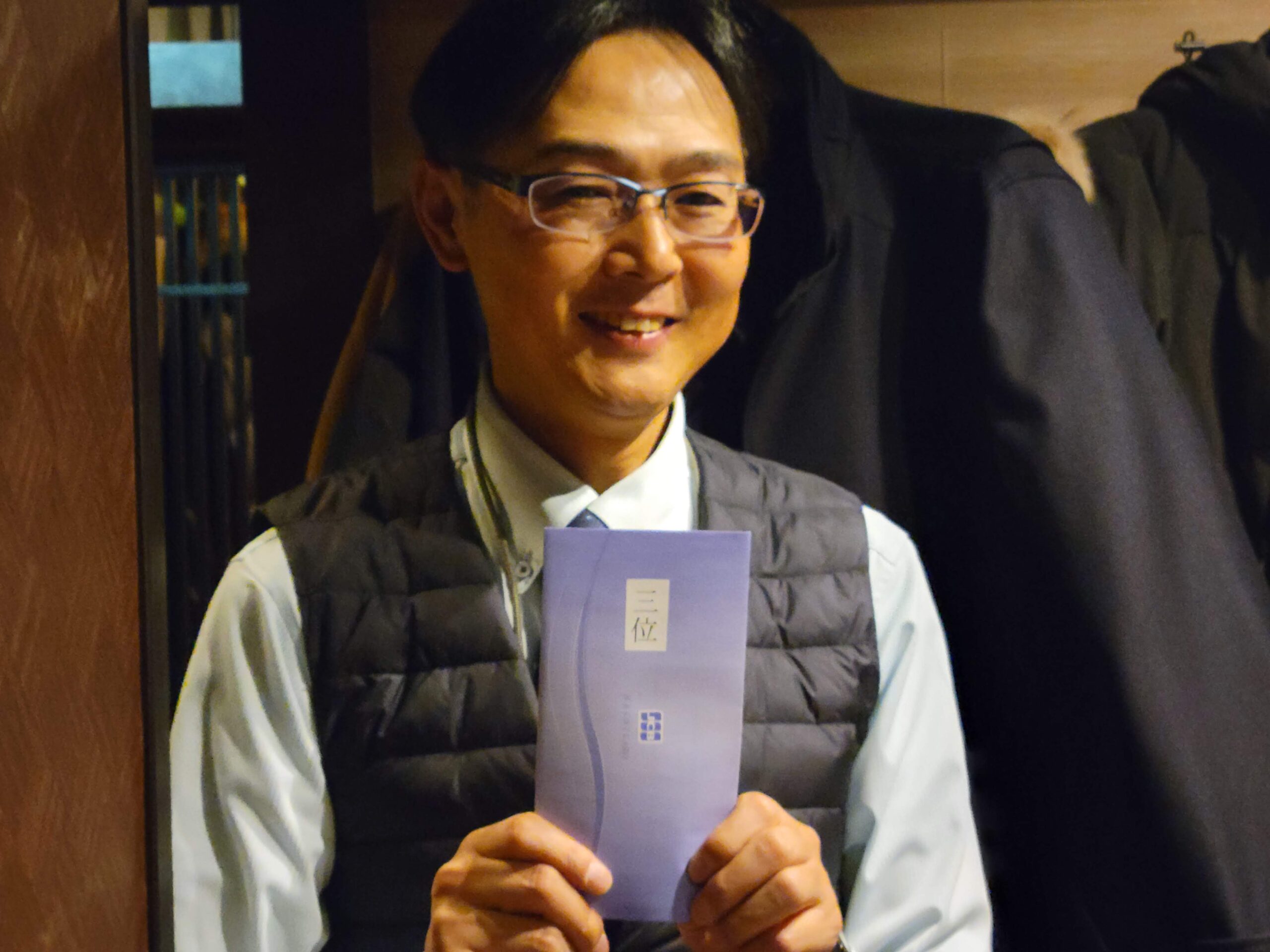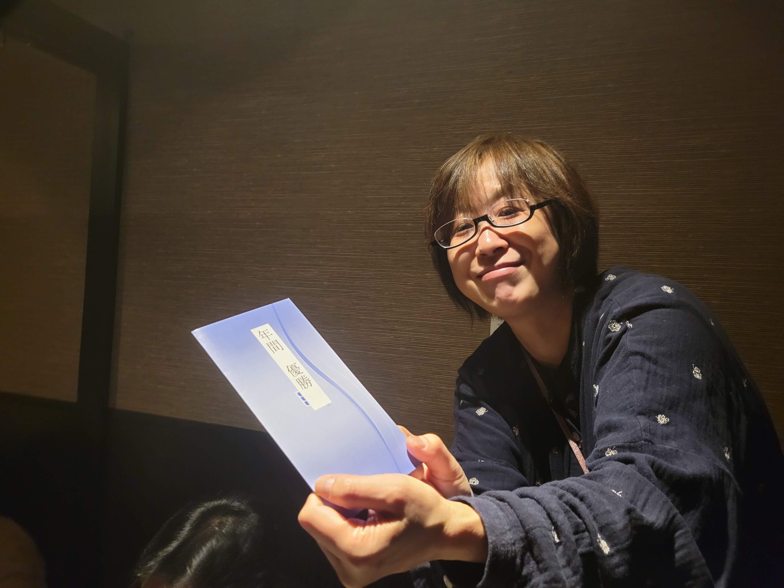 ボウリングの後の食事会にて、前年度優勝のkamotaさんに記念品贈呈がありました。